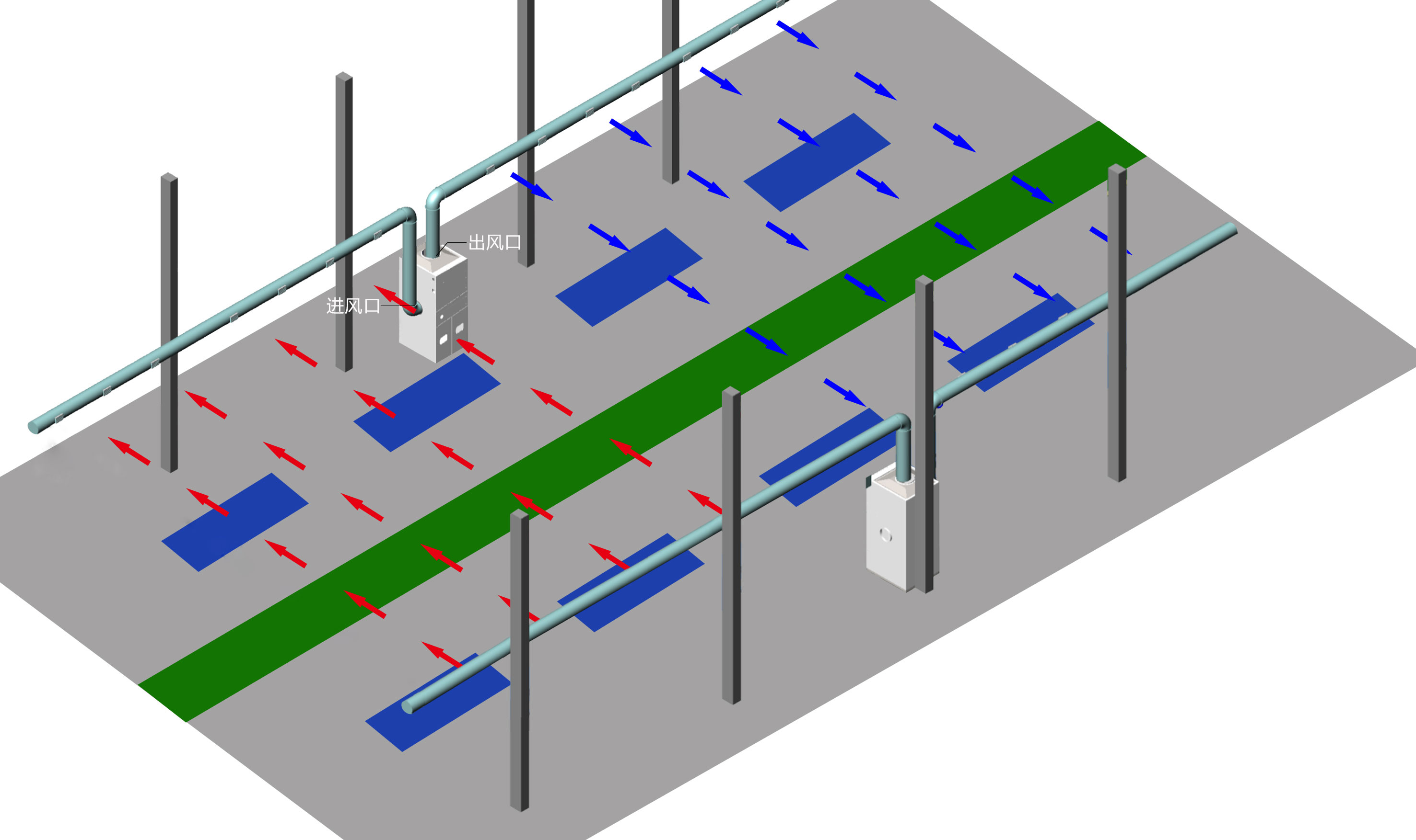 吹吸式焊煙除塵系統特征在于在廠房某一高度,兩側呈W型排布置多個吹風口和吸風口,通過吹風口將空氣射入大空間,形成前進方向一致的交錯多股平行射流;到一定距離后,每股射流與吸氣流匯合,形成固定的氣流路徑,使射流只能在縱向發展,因此射流在這個區域內的運動近似于平面運動,形成水平的空氣屏障;由于廠房空間大,布置的風口個數多,射流匯合一段距離后,在大空間中形成寬度比變化中的厚度大得多的扁平氣流;采用本發明方式控制高大工業廠房中的焊煙,就是利用在建筑物側墻一定高度吹出的噴射氣流形成空間隔斷,以吹風口中心為分層面,將高大工業廠房在高度上分為上下兩個區域,把工作區散發的焊煙控制在一定的高度范圍內,即廠房的下部區域為控制區,并借助于射流引起的氣流流動將焊煙等有害物帶到吸風口;分層面以上的區域為非控制區;焊煙等有害物在吸風口負壓的作用下被捕集,含微細粉塵的焊煙等有害物進入除塵器,焊煙等有害物的粉塵被分離后落入積灰室,凈化后的潔凈空氣從吹風口吹出,向對面送去,過濾下的焊煙等有害物粉塵會積攢在濾筒上,當濾筒飽和后,通過脈沖反吹清灰裝置,實施定時自動清灰,清理下的粉塵落入集灰斗。